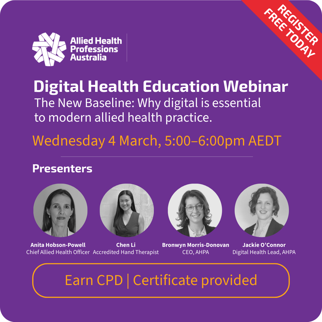 The session will feature the Commonwealth Chief Allied Health Officer, Anita Hobson-Powell, alongside Chen Li, Accredited Hand Therapist, who will share practical experience of how digital tools have enhanced clinical practice and reduced administrative burden. AHPA CEO Bronwyn Morris-Donovan and Digital Health Program Manager Jackie O’Connor will outline AHPA’s digital health program of work and where allied health professionals can access sector-specific support.